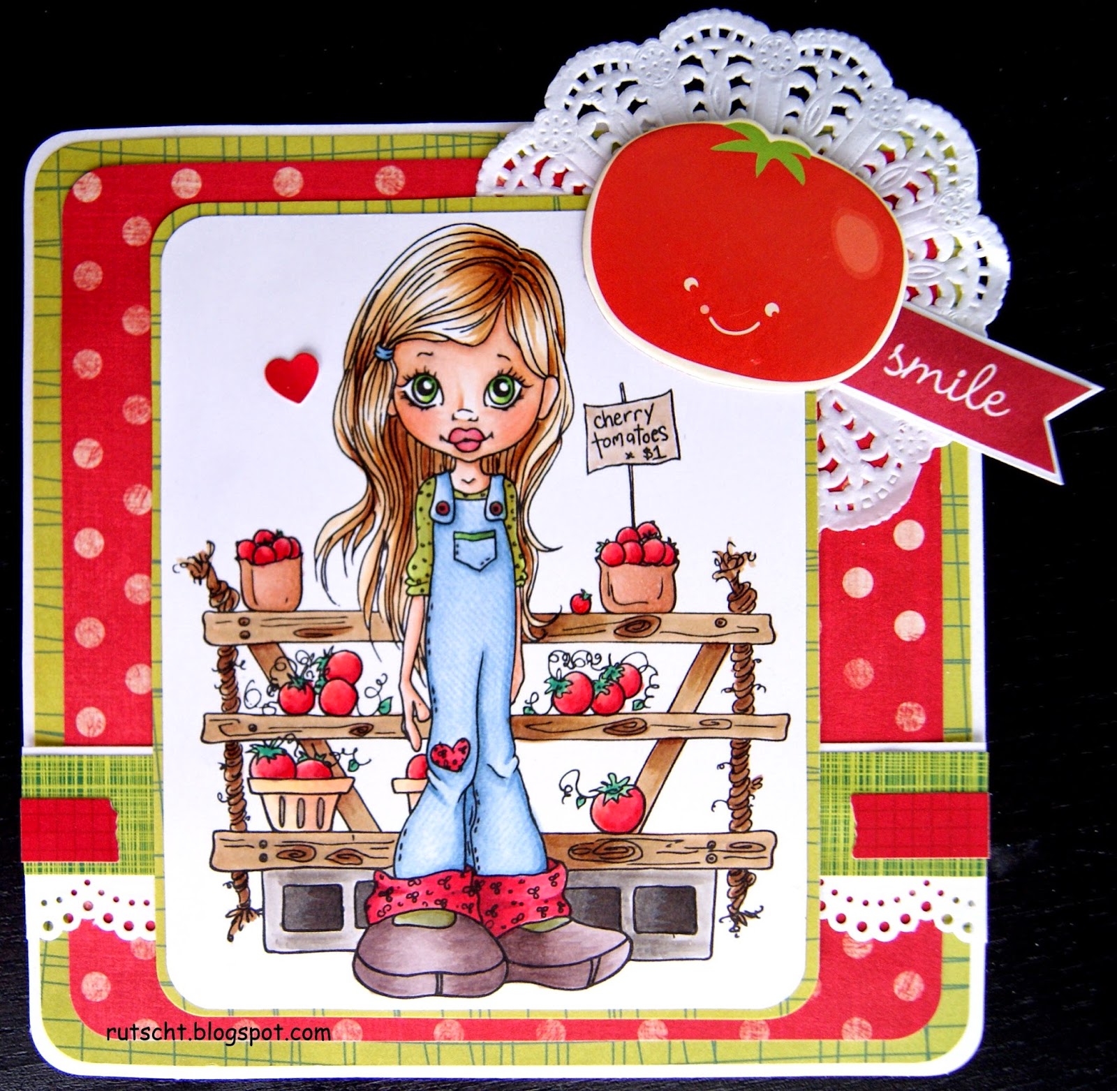 Éste es uno de los últimos sellos de Saturated Canary, es precioso. Y mientras lo coloreaba, por diversión, me acordé de unos papeles de Cosmo Cricket de temática hortícola, de los que me quedan algunos restos, y ese tomate que me venía genial para hacer una tarjeta con este sello.