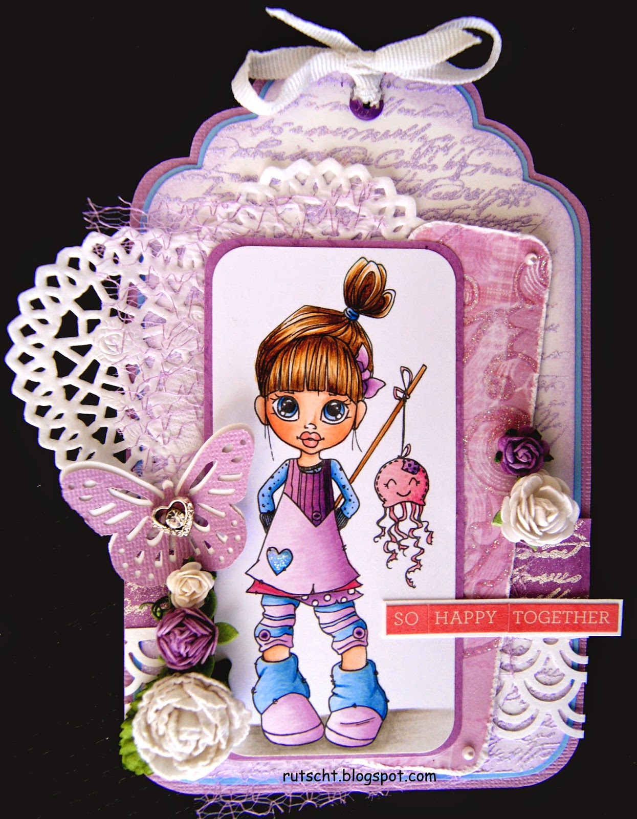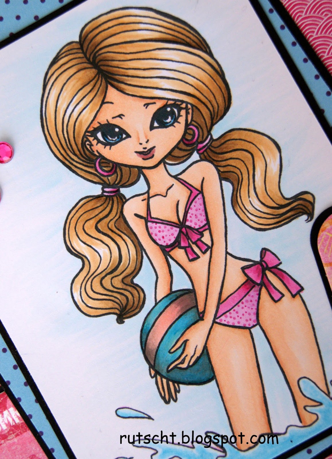La sirena es un sello de Kraftin' Kimmie, pintado con rotuladores Copic, pero hace tiempo que lo pinté y no sabría decir todos los colores que lleva, aunque son las gamas BV, V y más purpurina...